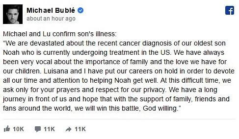 Δύσκολες ώρες για τον Καναδό τραγουδιστή Michael Bublé και την οικογένειά του, καθώς ο μικρός του γιος Noah διαγνώστηκε με καρκίνο.