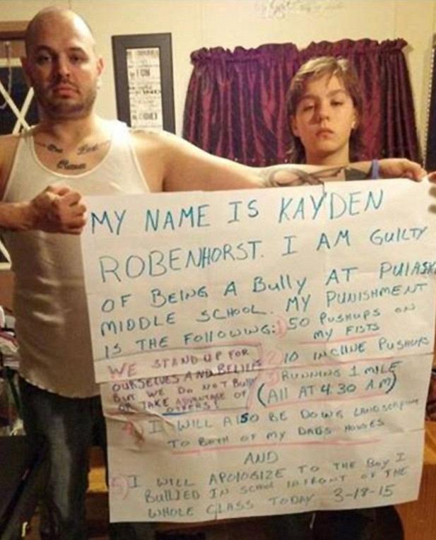 Ο Timothy Robenhorst από το Ουισκόνσιν των ΗΠΑ τιμώρησε τον γιο του Kayden, αναγκάζοντάς τον να κρατήσει ένα πόστερ στο οποίο έγραφε ότι είναι ένοχος για το bullying που έκανε σε συμμαθητές του.