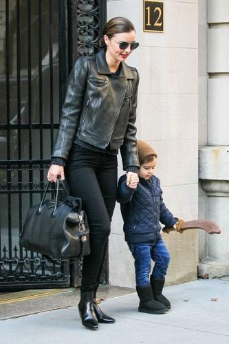 Μπορεί να φορεθεί από τις περισσότερες ηλικίες και να προσαρμοστεί σε εκατοντάδες διαφορετικά στυλ, ο λόγος για το biker jacket, που η Miranda Kerr, μας το προτείνει συνδυασμένο με μαύρο skinny jean και μεγάλη shopping bag.